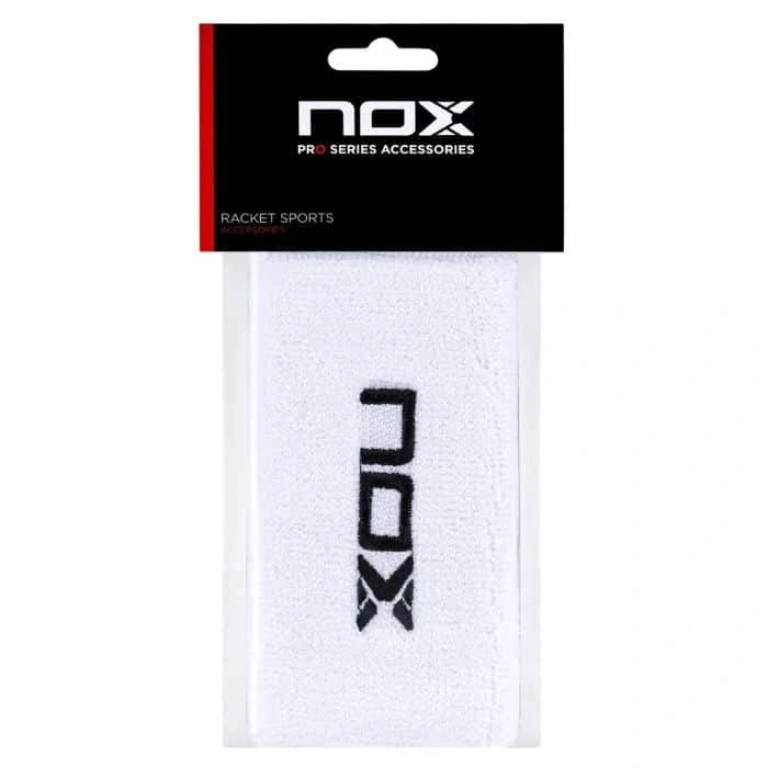 Blister (2 PCs) Nox Long Wristband White Logo Black. Protect your wrists while playing padel with the Nox long wristbands in white, featuring an elegant black logo. These wristbands are made from a blend of cotton, nylon and polyester, ensuring exceptional comfort during use.